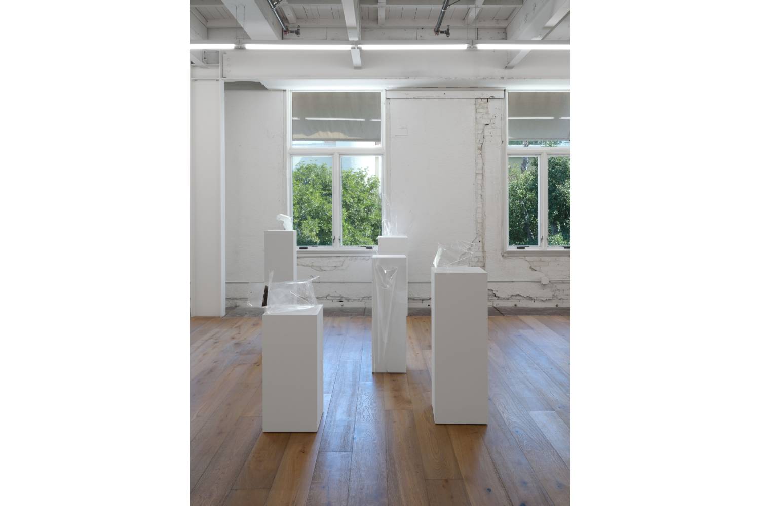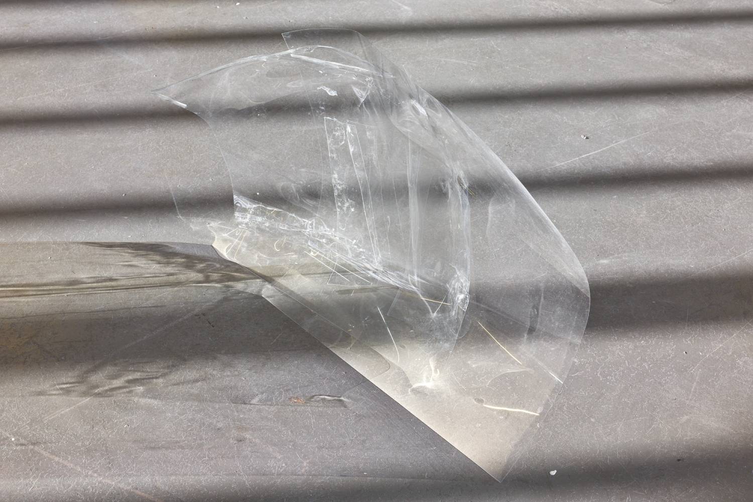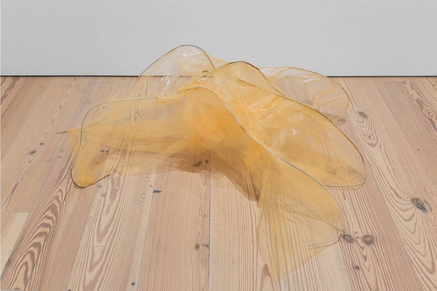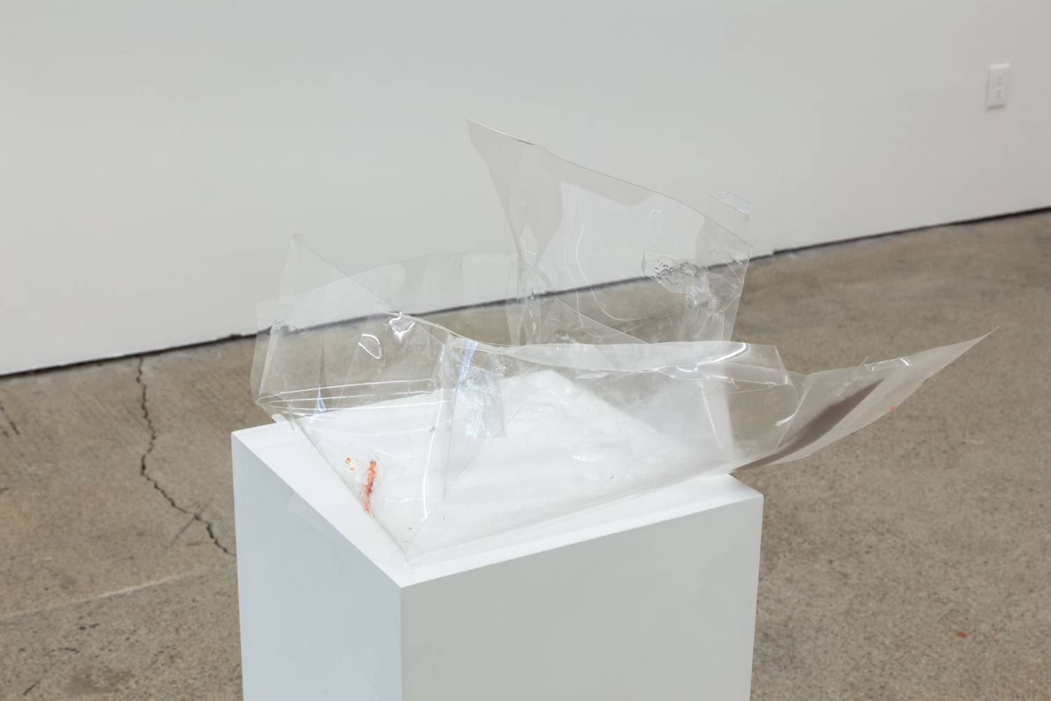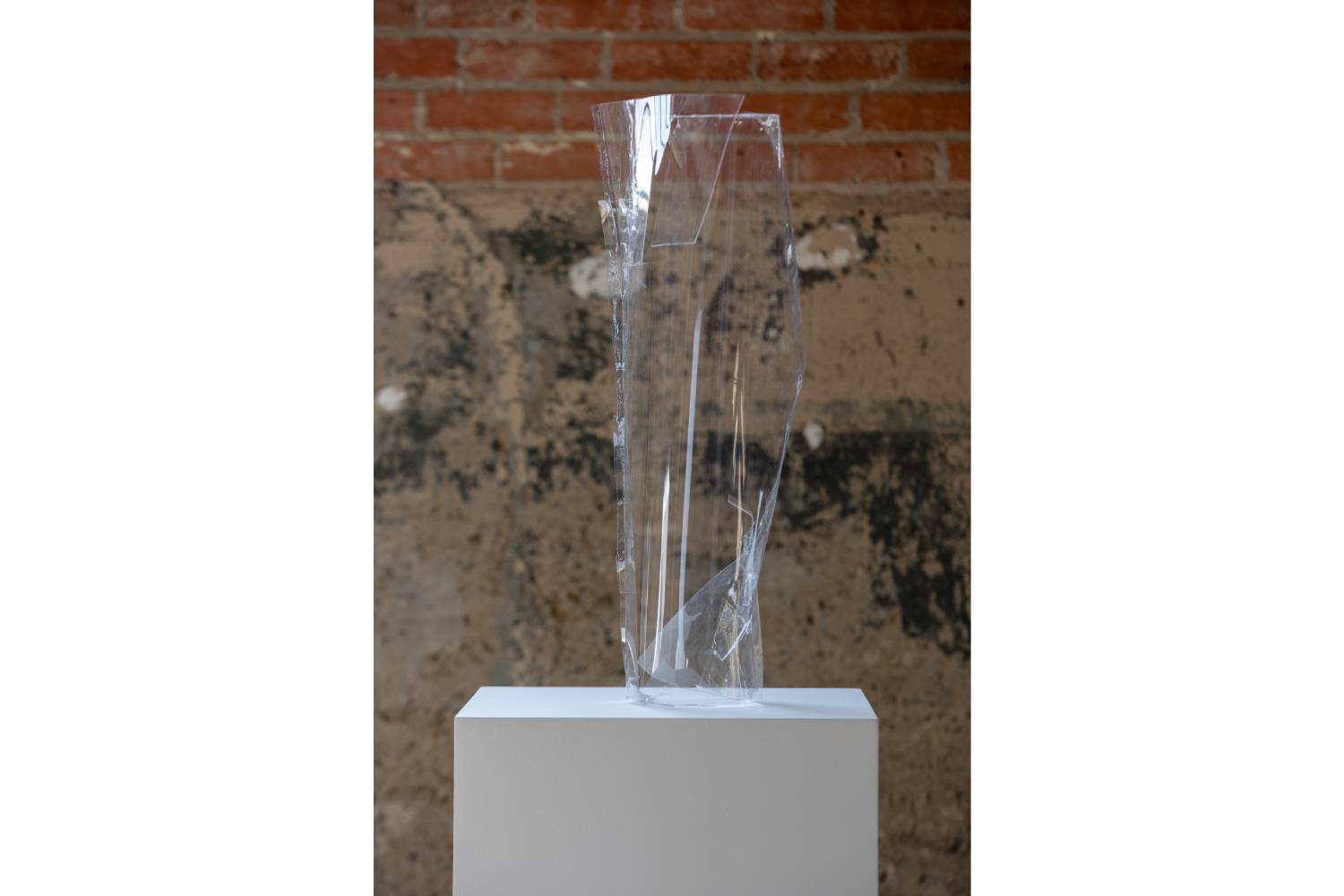 The ongoing series of sculptures called “Loop” began in 2021 without a title and has comprised the majority of Balema’s production since then. These works are made of transparent polycarbonate, thin clear plastic, that is folded, bent, cut, and glued — sometimes standing alone, sometimes using a plinth, wall or corner on which to lean. As vessels unable to contain (if filled they would leak), sometimes they seem to billow, sometimes they buckle from their angular edges and corners exerting pressure on the surfaces yet failing to hold them totally straight. Gravity is taken into account and is an agent in their composition, as is the floor itself, which seems to exert upward pressure on their gentle bodies. “Loop” is like a lowest common denominator of sculpture—volume, surface, and gravity—and, as such, resists speaking for sculpture, subtracts rather than adds to it. It is in this sense that we must understand the work’s transparency not via the fantasy, whereby there are no secrets and we might see all as it actually is, as the ideology goes,5 but rather exactly as a symbol for our lack of transparency to ourselves.6 To that extent, what might be represented by “Loop” is precisely your own looking coming at you from outside.