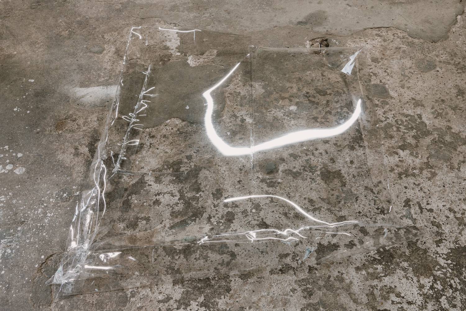 Disarmingly, Balema’s work distorts my usual looking in relation to the gallery space, especially through enhancing attention to the floor and footing. This was my experience at Bridget Donahue, New York, in whose space Balema’s work seems particularly at home, held by the wooden floor. “Brain Damage” is an astonishing series of sculptures, a network of white trouser-elastics placed, knotted, painted, and stretched at ankle height across the gallery floor with the momentum of nails and the wall, establishing contours and intersections just above the ground, some taut, some loose. “Brain Damage” is a surprise, its appearance modest and at the same time grave, a rude awakening. Has she really done it? Is this sculpture? It’s certainly not Fred Sandback’s geometrical threads, though it has to be mentioned. There’s something about the poorness of the material, the tokenistic way paint is applied, the loose ends, the placement so low it’s almost invisible, the likelihood of being trodden on, tripped over: all of this accentuates Balema’s humor describing the work as her foray into painting.