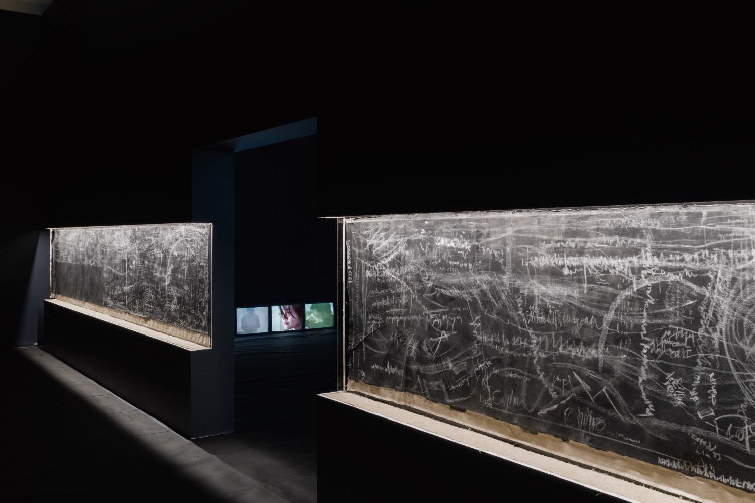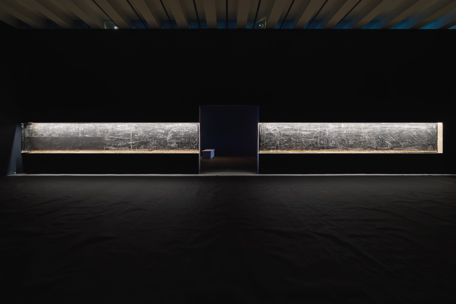 One of the first installations visible is two paintings in chalk and acrylic, Cream Cut I and Cream Cut II (2024–25), nestled in a cut-out wall. The paintings rest on the insulation inside the drywall. The gesture of burrowing suggests a permanence beyond simply hanging the paintings on the wall. These paintings were originally part of Daijing’s Haus Der Kunst project, where they were created through performances involving automatic writing. Performers inscribed indecipherable marks and words onto the canvases, producing artifacts that captured the energy of the act. The unintelligible written language, eraser strokes, and spastic mark making subliminally express a message of urgent anxiety.