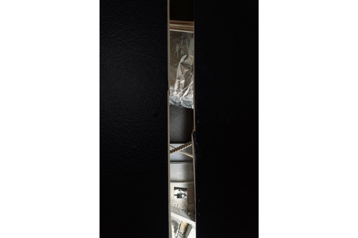 Nearby, a crack in another wall reveals the unseen mechanics of the Walker Art Center’s structure: pipes, scaffolding, and a photograph depicting shadowy figures. Taken together, Scale Figures” meditates on how we form understanding when not everything is known. Offering just hints of sensory details, visitors are left with abstract sensations rather than narratives.