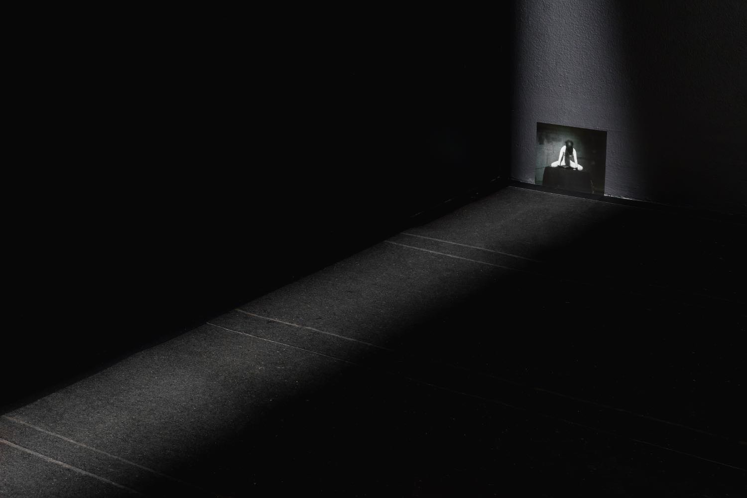 The exhibition’s second room features two video installations — the four-channel Faint (2023–24) and the twenty-four-minute-long The Hour Between Dog and Wolf (2021–24). Faint uses four video monitors showing dance footage. One close-up shows a woman crying while another performer runs their fingers against the floor. The actions teem with disquieting internal struggle manifested through subtle movements.