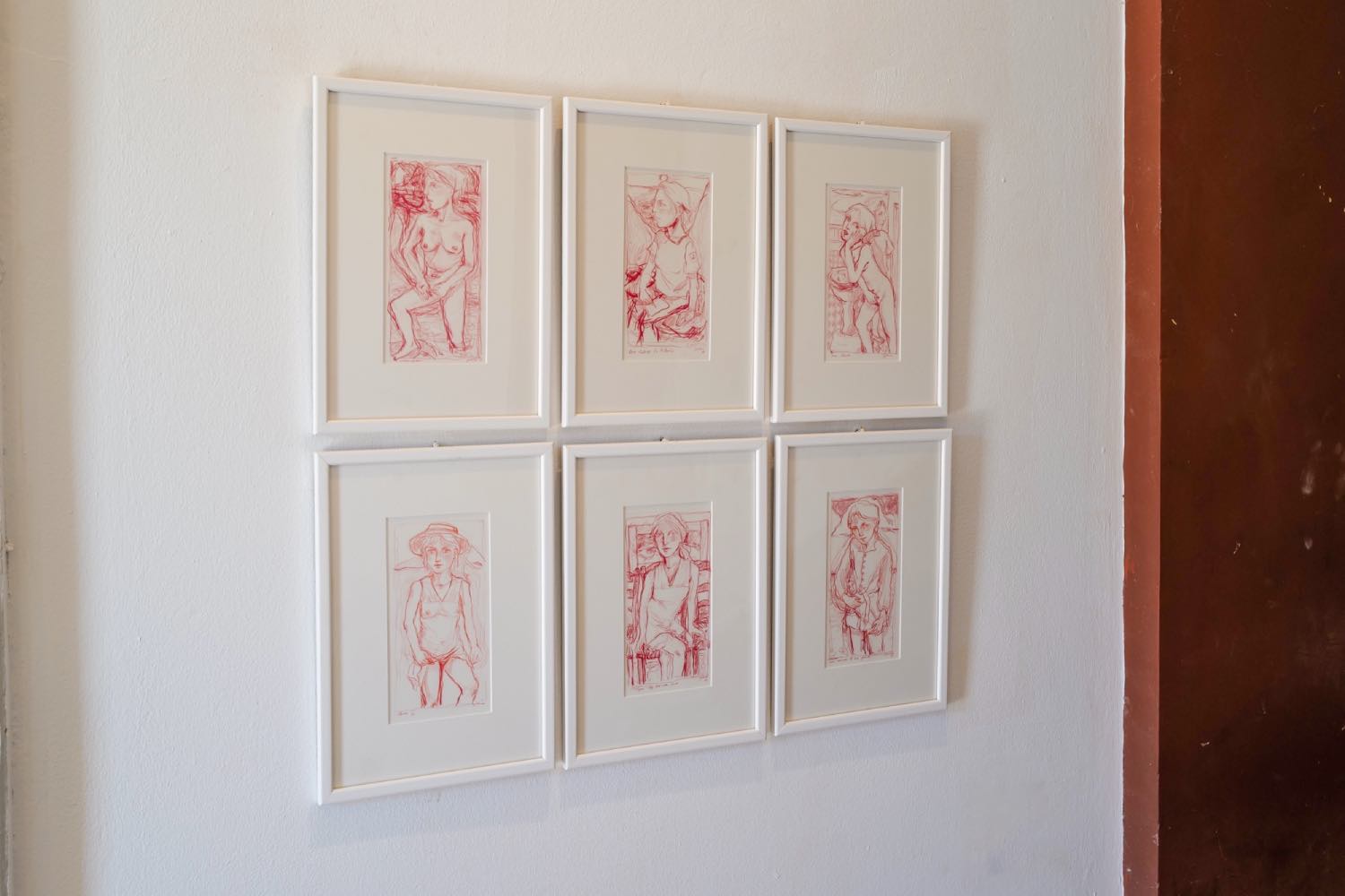 Like the island, our bodies are imagined as permeable vessels, floating among slippery spheres of influence. Dutch artist Joline Kwakkenbos’s luminous, sexually charged portraits of herself adopting various personas within vivid backgrounds populated by metaphysical alter egos — such as Whispering of Artemis (2025) — hang throughout the sun-drenched rooms of the villa and in an outdoor pavilion, designed by Ömer Pekin. There are also ghostly grayscale portrayals of local Fascist buildings by Laura Footes, such as the formerly Catholic Chiesa di San Francesco, now the Orthodox Agios Nikolaos, under a bright moon. The horizontal strokes rendering the rotund buildings in Lakki Cinema, Porous Souvenirs (2025), along with the blurs of lone fleeting figures, invoke the unremitting tempo of transformation.