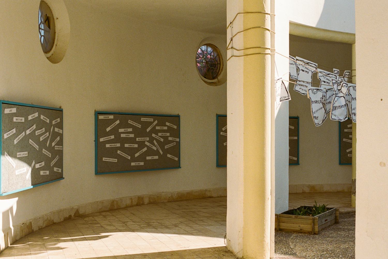 Yet our identities are shaped by those who wield the official pens. A Rationalist primary school in the Mussolini-planned town of Lakki hosts Gülsün Karamustafa’s site-specific installation Mother Tongue (2025), which names native languages forbidden by occupiers — just as Greek was banned under the Italian Fascists — in labels displayed on classroom-style bulletin boards. The title is scrawled in black ink on paper dresses, strung on clotheslines across the stark portals of the courtyard. We are separated and united by language, mere marks on a page: Ali Kazma’s Calligraphy (Resistance Series) (2013) follows the meticulous movements of a scribe’s handcrafted pen across a white page, forming elegant sweeps of ink that appear abstract to the untrained eye. National identity is both education and indoctrination – an instrument of control, often used to divide societies. Despite the ongoing acrimonious political relationship and violent history between their two nations, Greeks and Turks — who make up about half of the visitors to Leros — coexist harmoniously, using different names for the same dishes and many other common cultural elements.