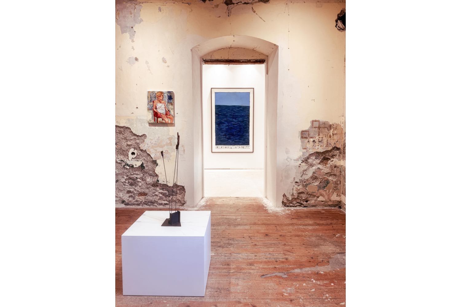 Kostis Velonis’s paintings convey a state of fluidity in the tension between isolation and coexistence. The colorful People Were Mostly Weather (2025) summons an enigmatic, mystical fable populated by objects — a hand, a sphere, two figures — that are nearly identifiable yet ultimately unnamable. In Monument to a Shadow at My Studio at 2AM (2025), an imposing black specter looms on the verge of exiting the frame, at once menacing and endearing in its resemblance to a fuzzy beast — or the artist’s psyche? The midnight-blue background, streaked with splinters of light, echoes the peeling layers of the walls: an accidental timeline revealing hints of the building’s past lives. On a pedestal opposite, Lucio Fontana’s dynamic terra-cotta Octopus and Shell (1937) entwines the mollusk with the bulging watery form as if vanquishing or becoming one with it.