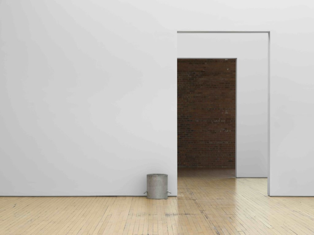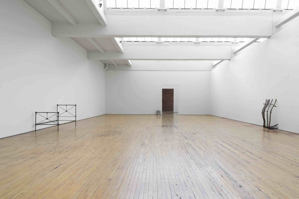 “Properties” is the title of Cameron Rowland’s exhibition at DiaBeacon. “Properties,” here, is used in the plural form. The exhibition unfolds as follows: the first room, built as an entry vestibule, serves as the context for the distribution of the exhibition pamphlet, written by the artist. At a glance, this room is about one-fifth the size of the room that follows. The pamphlets are stacked in threes on a bench placed on a wall to the left of the viewer. The rest of the room is empty. The adjacent room is used to display four elements: an overturned pot placed to the right of the entrance, against the side wall, followed by the structure of a bed, its head facing away from the viewer, and positioned in the center of the right wall, adjacent to five scythes placed in the middle of the left wall. Slightly to the left of the center of the back wall — offset from the viewer’s path, while on the same trajectory suggested by the entrance to the exhibition from the left, through the vestibule — a series of documents are arranged one after the other in two rows, under glass and framed. This arrangement — moving from the first point to the last — encourages an experience of each element as introducing and following the next; they are interrelated, forming a whole system.