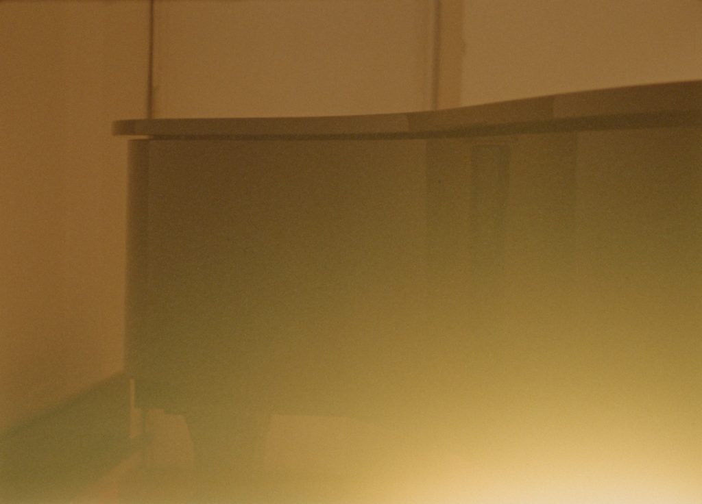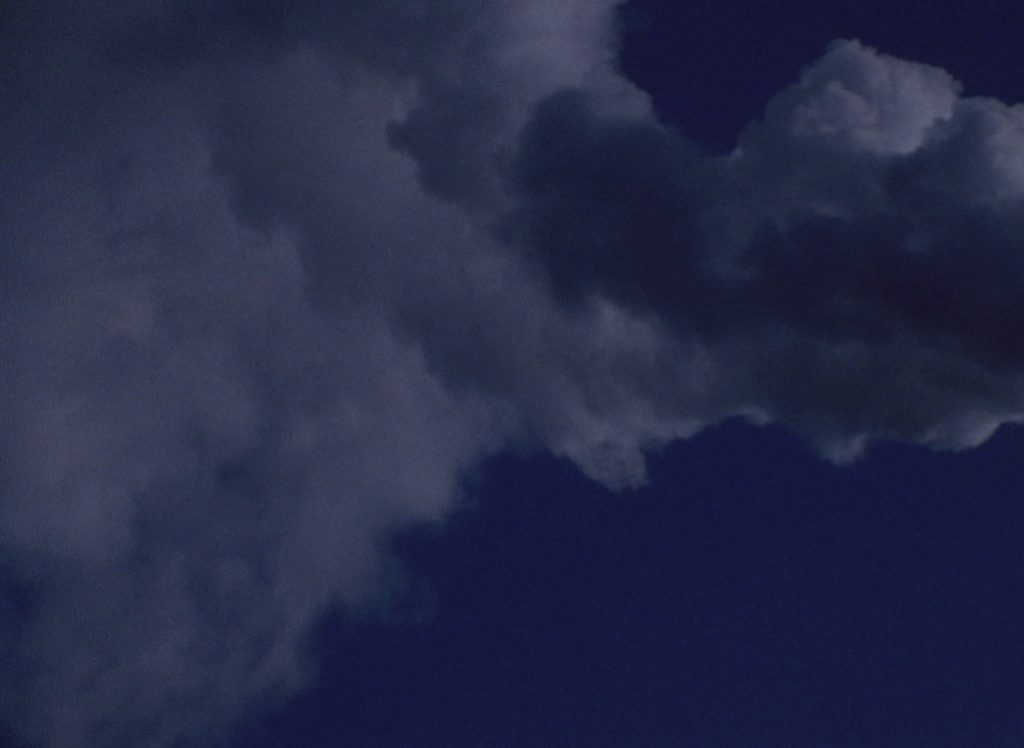 Giller’s 2023 work actors, for instance, uses the brightness of the exhibition space itself as a variable element in the work. In the 16mm film, a thick cloud of white smoke billows across a deep navy sky. The smoke is barely visible against the starless firmament, and without its movement across the visual field, one might mistake the frame for a flat wash of navy blue. Multiple prints of the film have been produced at different brightnesses, and the brightness of the print displayed is determined by the conditions of the work’s exhibition. The work’s enigmatic title gestures to these prints, each playing a specific role as it is matched to the brightness of its surroundings.
