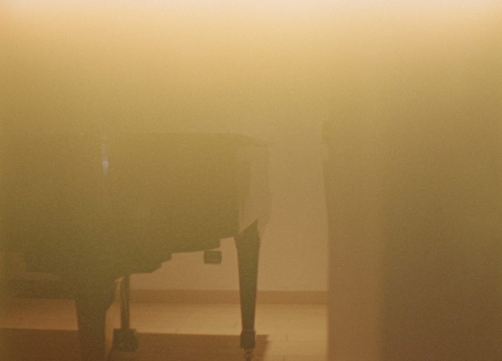This is most acutely articulated in Giller’s recent video work systems/structures (2024). First shown as a 16mm film transferred to digital projection at Artissima in Turin in 2024, the work consists of a 107.8 foot film reel that, when projected, depicts several angles of the back-side of a quiescent piano. The footage has a warm orange tone, suggesting a lack of post-processing, and the silhouette of the individual operating the camera is visible reflected in the piano’s curve. After almost half a minute of the first static shot, the film cuts closer to the instrument. This time the shot lingers for only nine seconds. Attentive viewers may notice a pattern: the length of each shot is determined by the piano’s measured distance from the camera.