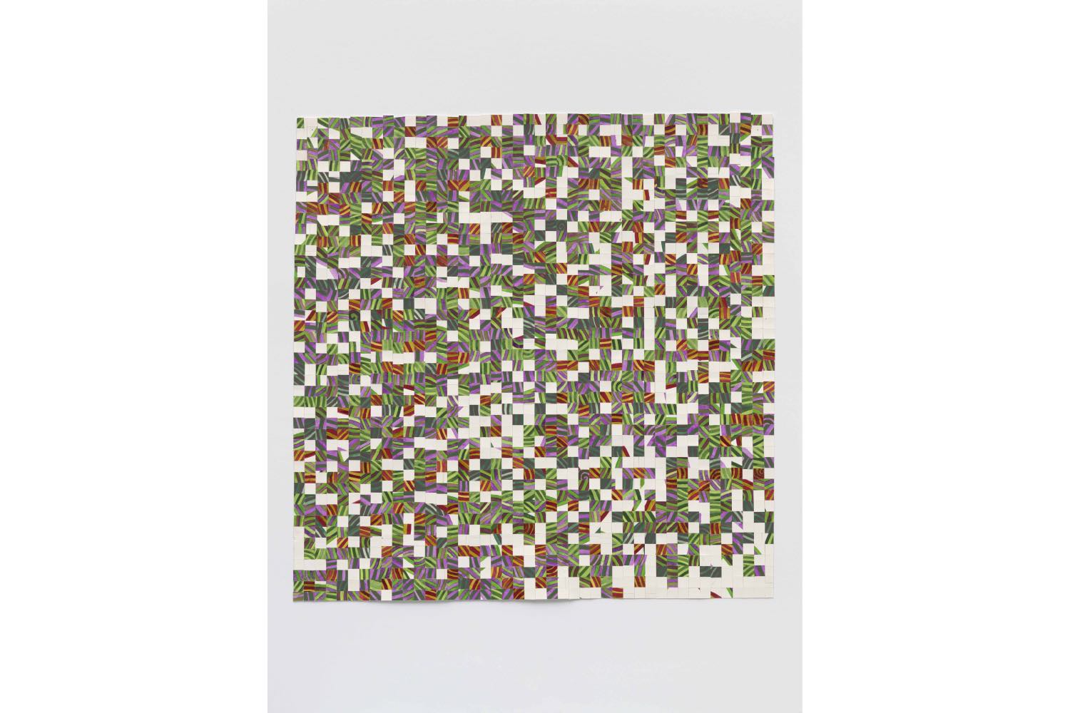 The same themes are reiterated in the “Slarips” series (2023), the title itself a reversal of “spirals.” Here, four graphite and watercolor works on paper face each other across opposing walls in the adjacent room. These works confront one another as if attempting to embrace a single, unified universe, which is never fully achieved. Each piece is, rather, a constellation in itself: a tessellated composition created from drawings that Horn cut out on small cards and reassembled. The collage medium garners here an even more open-ended attitude. Each piece is a reinvention of a mosaic-like blending structure, where full and empty spaces engage in a formal dialogue, enabling immersive and unmediated encounters with a multitude of potential compositions that are also referenced in the titles of each individual work — different misspellings of the word “spirals.” In this way the works reflect the multiplicity of identity construction, revealing frayed images that seek stability that deliberately eludes them. Although language is visually absent, the titles of these two series attest to Horn’s longstanding interest in idioms and slang.