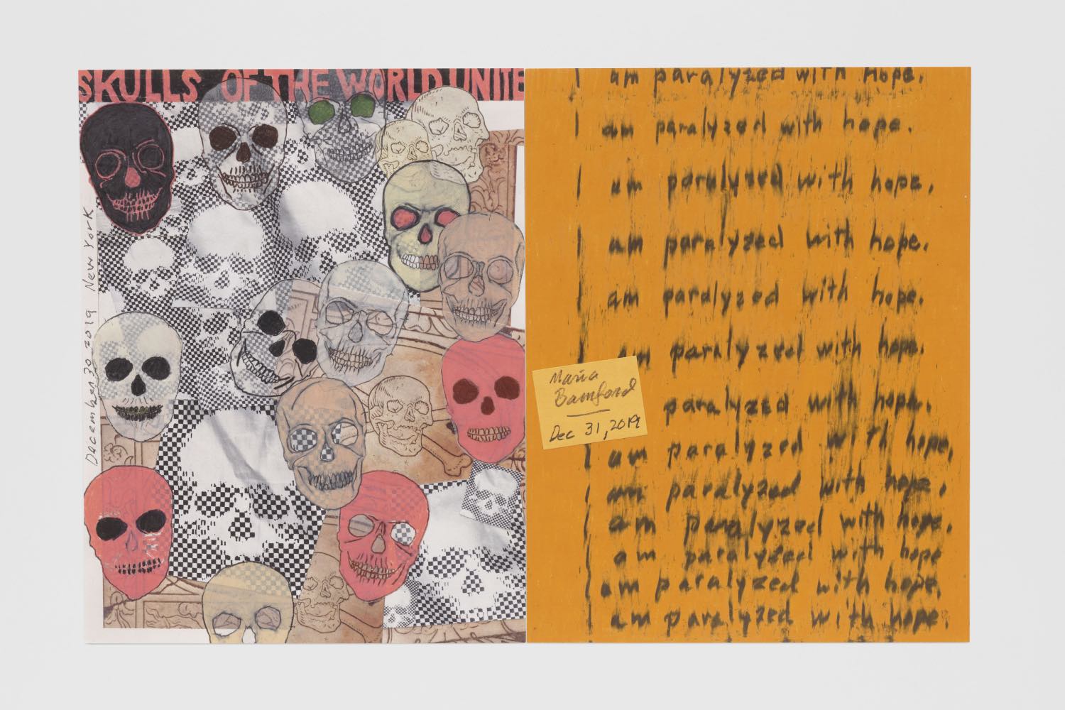 In White Raven 1: Red Hope (2022), for instance, the phrase “I am paralyzed with hope” (a quote by American stand-up comedian and actress Maria Bamford) is repeated on a red page until it resembles a scratching sound — akin to a desperate cry for help from the masses — and becomes more relevant and touching today than ever. Similarly, Screaming • Heat Wave (2022) shows the artist with her mouth wide open. Just below the photo, as if it were a diary entry, she writes: “I’m beside myself. I’m losing my head, I want to pull my hair out. It’s getting under my skin and taking my breath away, I could cry my eyes out or laugh my head off.” It is precisely this diaristic approach, undertaken daily for fourteen months, that encapsulates the poetic aspirations of the entire series. Here, each piece builds on another through repetition and variation in time and space.