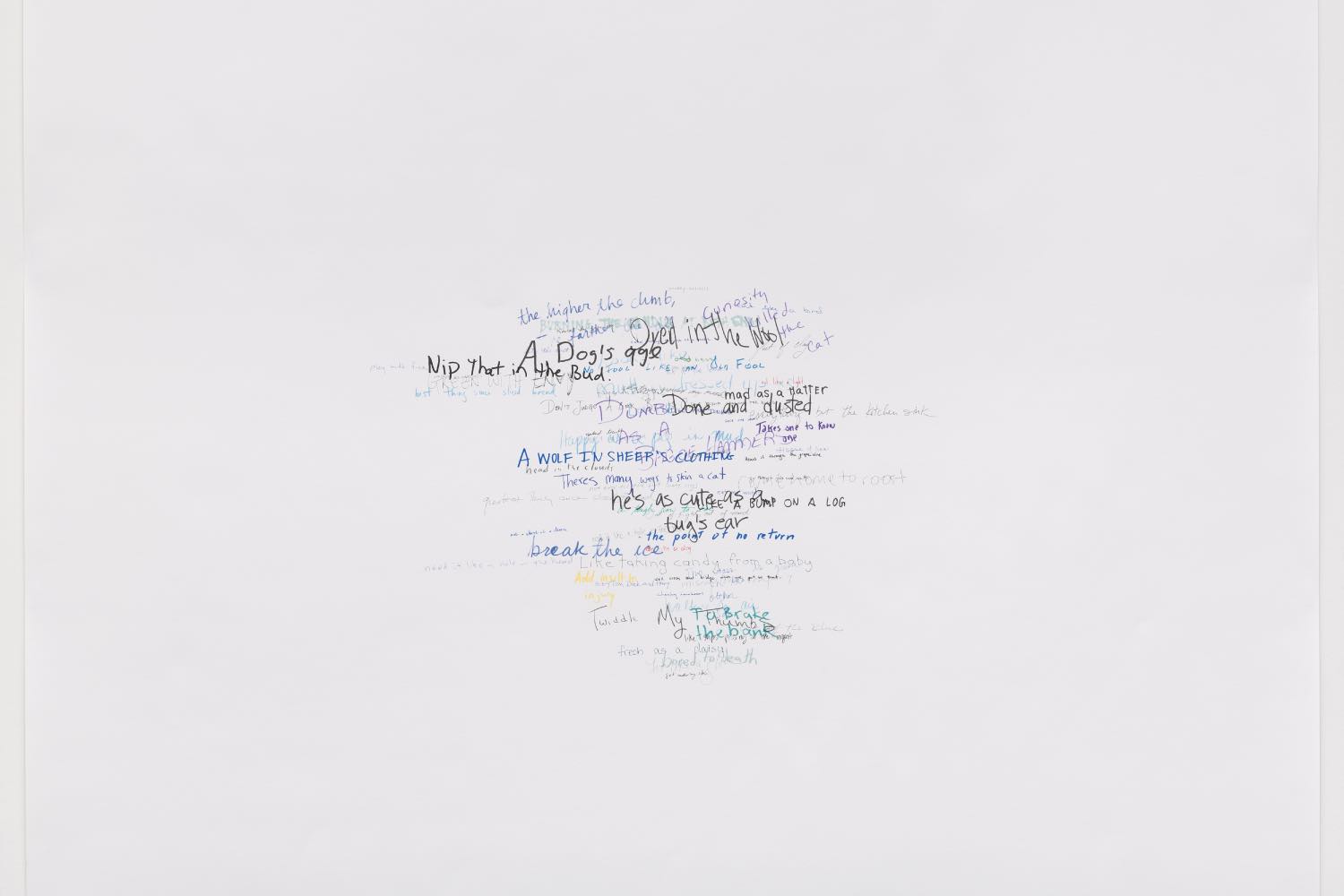 The voices “rise” even higher in the third venue, where the exhibition concludes with the “Wits’ End Mash” series (2019). This consists of four large, overlapping silkscreens bearing up to three hundred and fifty handwritten proverbs and idiomatic phrases, which the artist asked three hundred people to write down. Letters swarm in a chaotic manner, appearing in various colors and transparencies and overlapping to configure layered and abstract visual compositions. “He’s as cute as a bug’s ear”; “going to hell in a handbasket”; “beat around the bush”; or “like ships passing in the night” are just some of the idioms that culminate in a collective voice of knowledge.