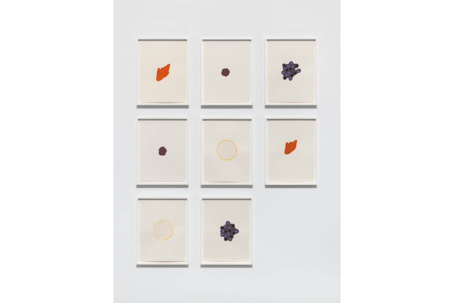 The first venue foregrounds the “Frick and Fracks” series (2018–22 and 2016–23). Each work comprises eight gouache and watercolor drawings, arranged in lines: two sets of three, and one of two. From a distance, the piece resembles a composition of undefined vegetal species or cellular organisms spilling out from the white of the wall or paper. But up close, they reveal a play of repetition and variation – a kind of mnemonic choreography in which mirrored forms mutate just enough to evade total symmetry. This visual logic is reminiscent of the memory game in which players must remember pairs of cards by turning them over. However, there is a slight difference here. In Horn’s artistic vision, subtle variations always exist and interplay, and it is within these modulations that new identities can mold and emerge. The eye is constantly stimulated as it moves from one drawing to another, looking for similarities and divergences.