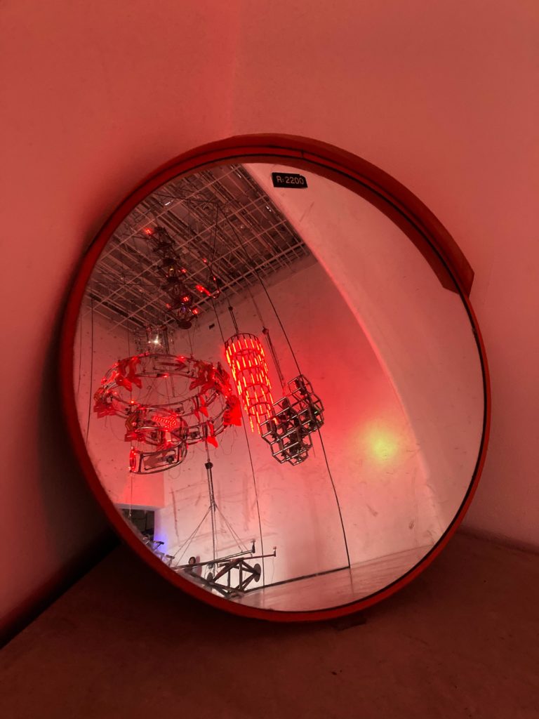 UNDER CONSTRUCTION — Tracing the Trajectory of SIDE CORE” describes the museum in flux, with the artists documenting the street as they mediate the space between film and sculpture. rode work ver. Ishinomaki (2017) shows an old factory heavily damaged by the Great East Japan Earthquake of 2011. There, a skatepark is built and dismantled in a single day. When the factory was finally demolished, the remaining skate ramps were removed and redistributed around the city. rode work (construction lights) (2017/2025), next door, carries its own vocabulary of construction: a mass of warning lights, pipes, chains, and other materials hang from the ceiling like a chandelier, picturing the city — and the work itself — in a state of perpetual change. The sound of passing traffic is echoed by breath of night (2024), with a bank of car headlights that processes the noise of museum foot traffic into the image of a traffic jam.