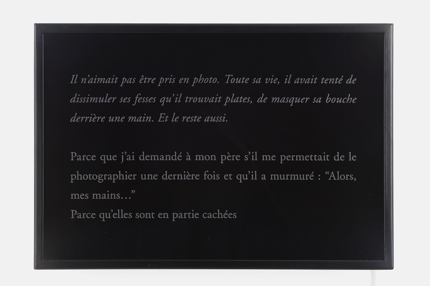SC: The project itself dictates the medium. For instance, with On the Hunt (2017), I had all the text completed, but for two or three years there were no accompanying images. When I exhibited it at the Musée de la Chasse, Paris, it was presented without visuals. I felt the text stood on its own, and I couldn’t envision suitable imagery. So I displayed it as such at the museum. I then set it aside until inspiration struck. In contrast, Voir la mer (2011), which features people seeing the sea for the first time, is silent because I believed any text would diminish its impact. I thought it more compelling to let viewers imagine the subjects’ thoughts rather than state them explicitly. Sometimes, I prefer to leave things unsaid.