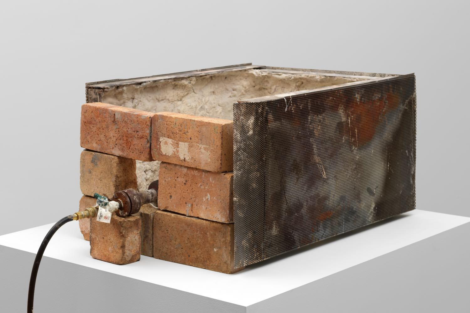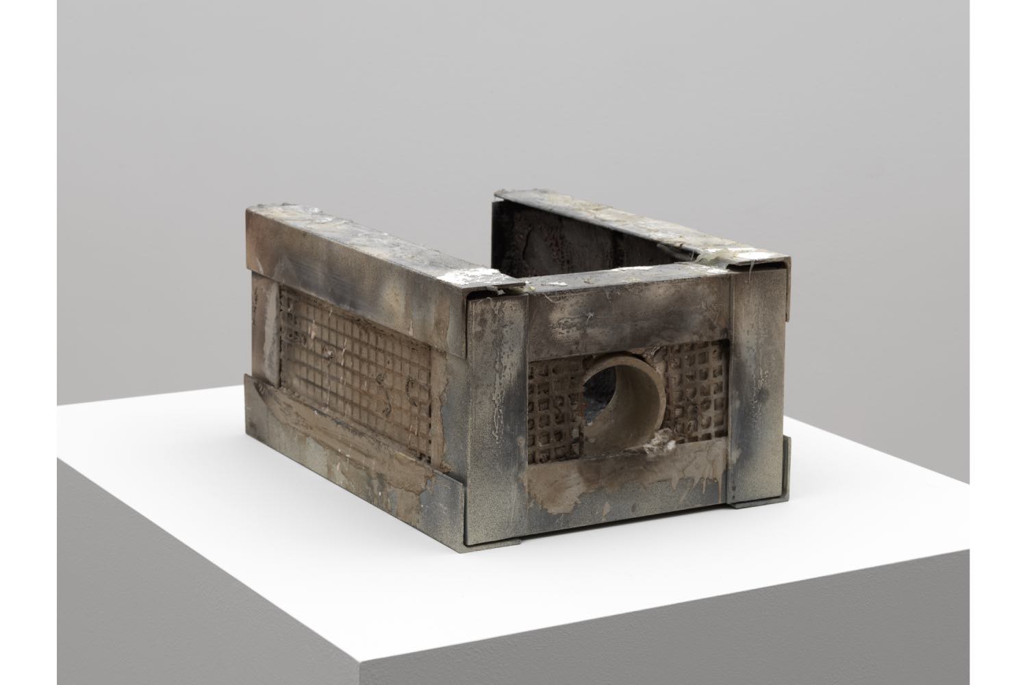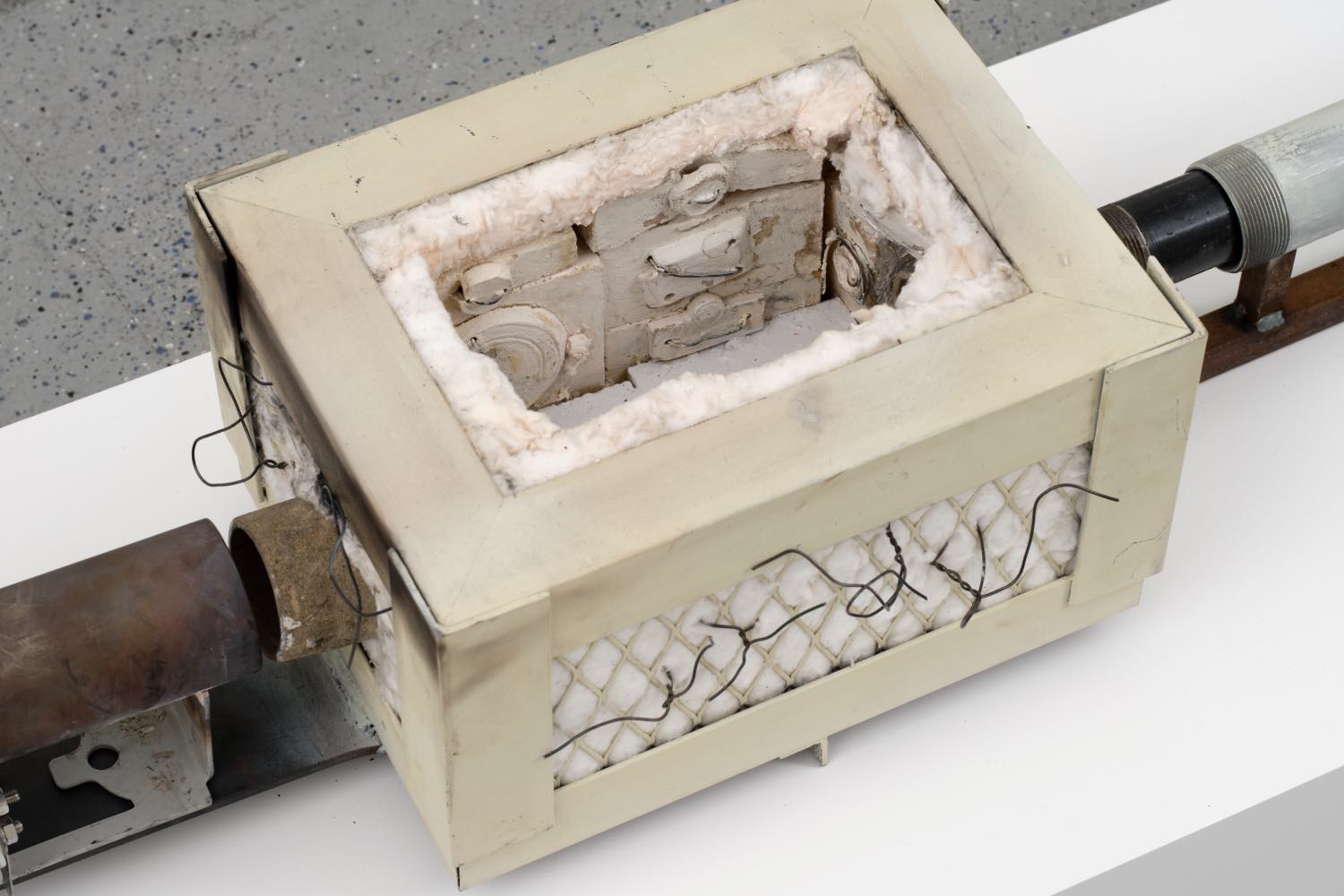 Even as the kilns are functional, Friedman-Pappas shifts away from waste as waste product, enacting a reversal of alchemy. In her hands, industrial and base materials transform not into precious metal, but into an intervention in the governing logic that casts refuse into dollars. The charred containers for melting remnants under fire at extreme heats become emblems of the artist’s overarching rejection of inherent identities attached to materials and reification of physical matter under capitalism. By imaging a building as kiln as a closed system, a built enclosure capable of hastening states of decomposition, her work echoes Robert Smithson’s sense that everything must return to dust in accordance with the Second Law of Thermodynamics. But her work more closely invokes the First Law: energy can neither be created nor destroyed, only altered in form, echoing the artist’s conviction that there’s no breaking the system, only reformulating.