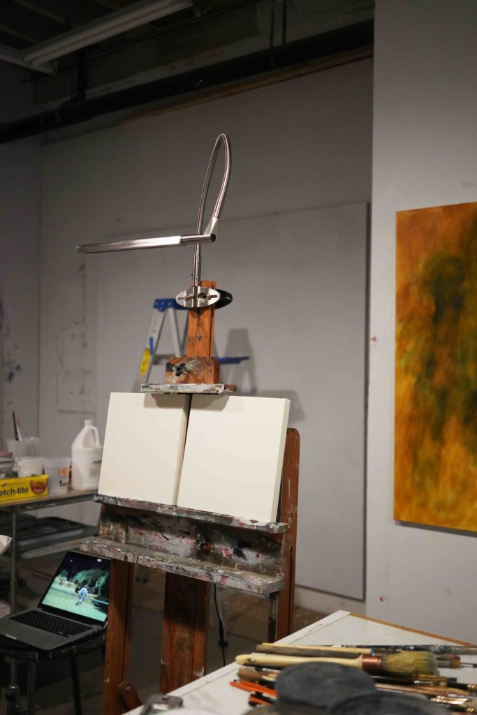OG The space being part of this trifecta feels crucial. The Clerk’s House is far from a traditional gallery — it’s several small rooms over multiple floors, and by the time viewers reach the attic, it feels so crammed but then there’s a painting hanging off of two screws, moving about a bit in the breeze from an open window. In a previous show, “Youth,” at Hakuna Matata in Los Angeles, you showed a single painting hanging from the ceiling of a treehouse-like structure in the gallery, which is in a private backyard. You do not seem to be particularly interested in showing large abstract paintings in white cube spaces. So, I want to ask you about your approach to display and installation. What do paintings do in space?