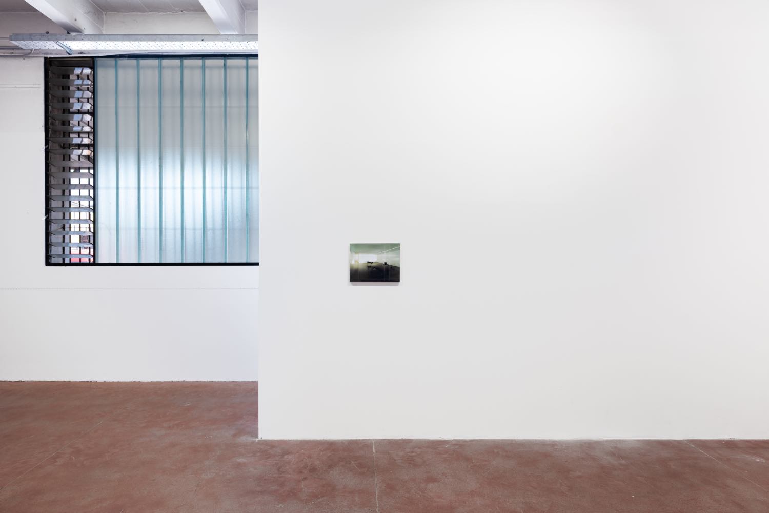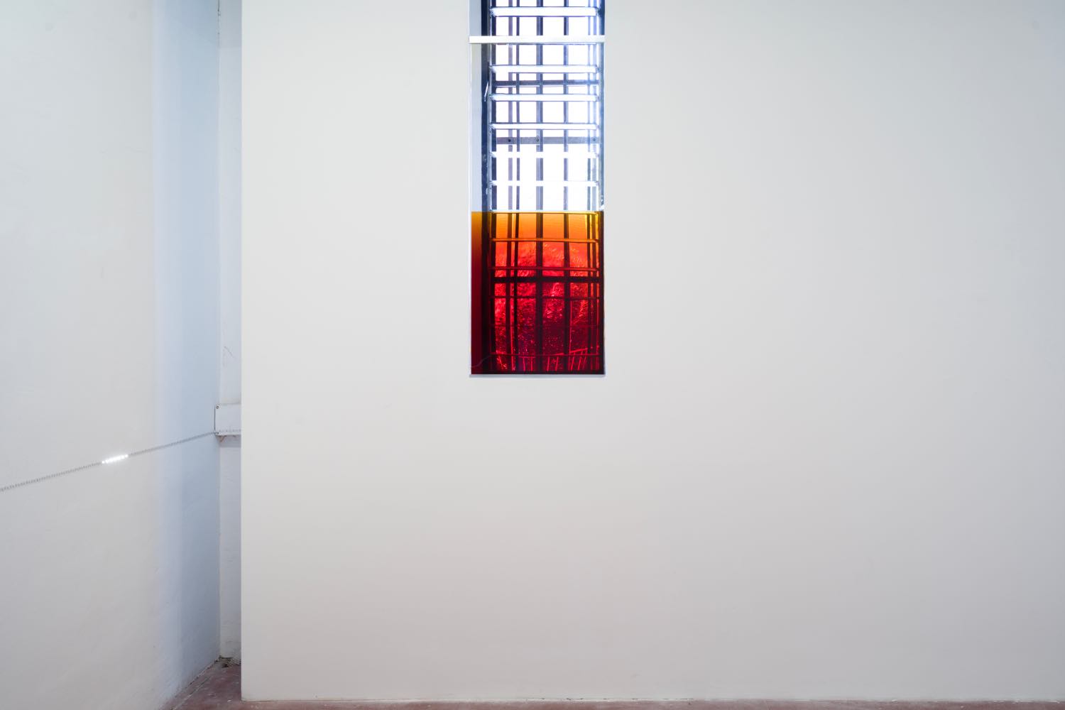 Nat Faulkner approaches time through slow chemical transformation. His plexiglass window [Untitled (Iodine), 2025] filled with liquid Iodine seeps into the architecture, literally staining the floor. A second work, Untitled (Stephenson Street) (2025) carries the bodily metaphor further, suggesting skin, fluid, and dissolution. It speaks to time not as duration but as corrosion — an uncontainable seepage through material, memory, and space.