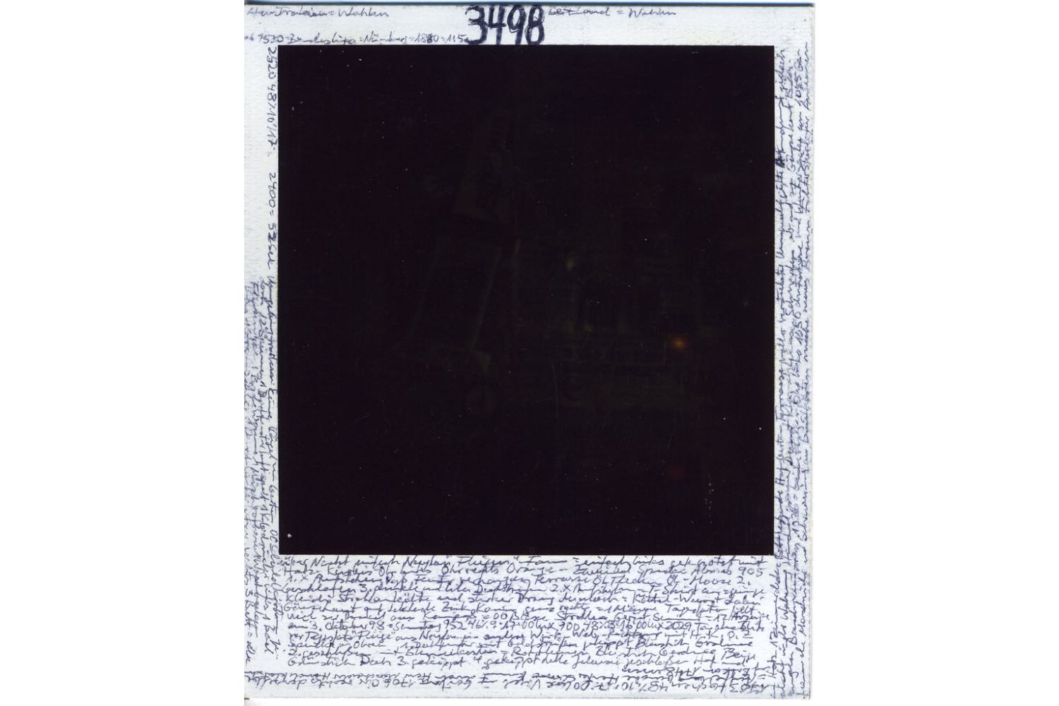 In this entropic register, Horst Ademeit’s obsessive archive feels less like an outsider’s paranoia and more like a parallel cosmology. 3497 (02.10.1998) (1998) is one of his daily Polaroids, annotated with elaborate data meant to track and prove the existence of invisible “cold rays.” These artifacts enact their own steady state: a compulsive ritual of documentation that resists both end and purpose. Like the steady-state universe, Ademeit’s project never culminates; it simply continues, dense with meaning and blind spots.