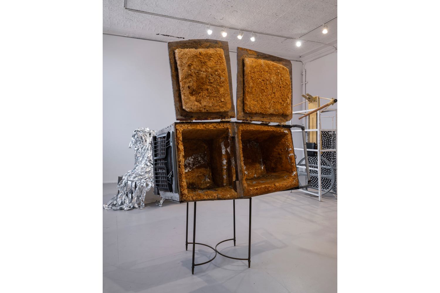 Ser Serpas’s sculptural installations made from urban detritus (all 2025) elegantly showcase her ability to borrow from chaos toward generative ends. Of the six works, find me and surrender cadence sweet trite maybe lose tinges of solitude and again acknowledge me, tube of brief cadavers made sadder still and it festers while it stances up in that tree most concisely demonstrate Serpas’s attunement to the theatricality of failure, in which accumulation does not necessarily result in meaning-making, but detours into impossible architectures, and short-circuits into apparatuses that know no distinction between interiority and exteriority. Serpas’s sculptures are neither artifices nor artifacts; intimately arranged and estranged by their editing, they turn the process of positioned collecting against itself. An ontology is implied here: the intensity of labor involved renders Serpas’s invisibly implicated body a surrogate and an accoutrement. And, if anything, Serpas tells us that our flesh can have these seductive encounters with abandoned objects: so much so that we might re-animate their potential with our own willed spirits.