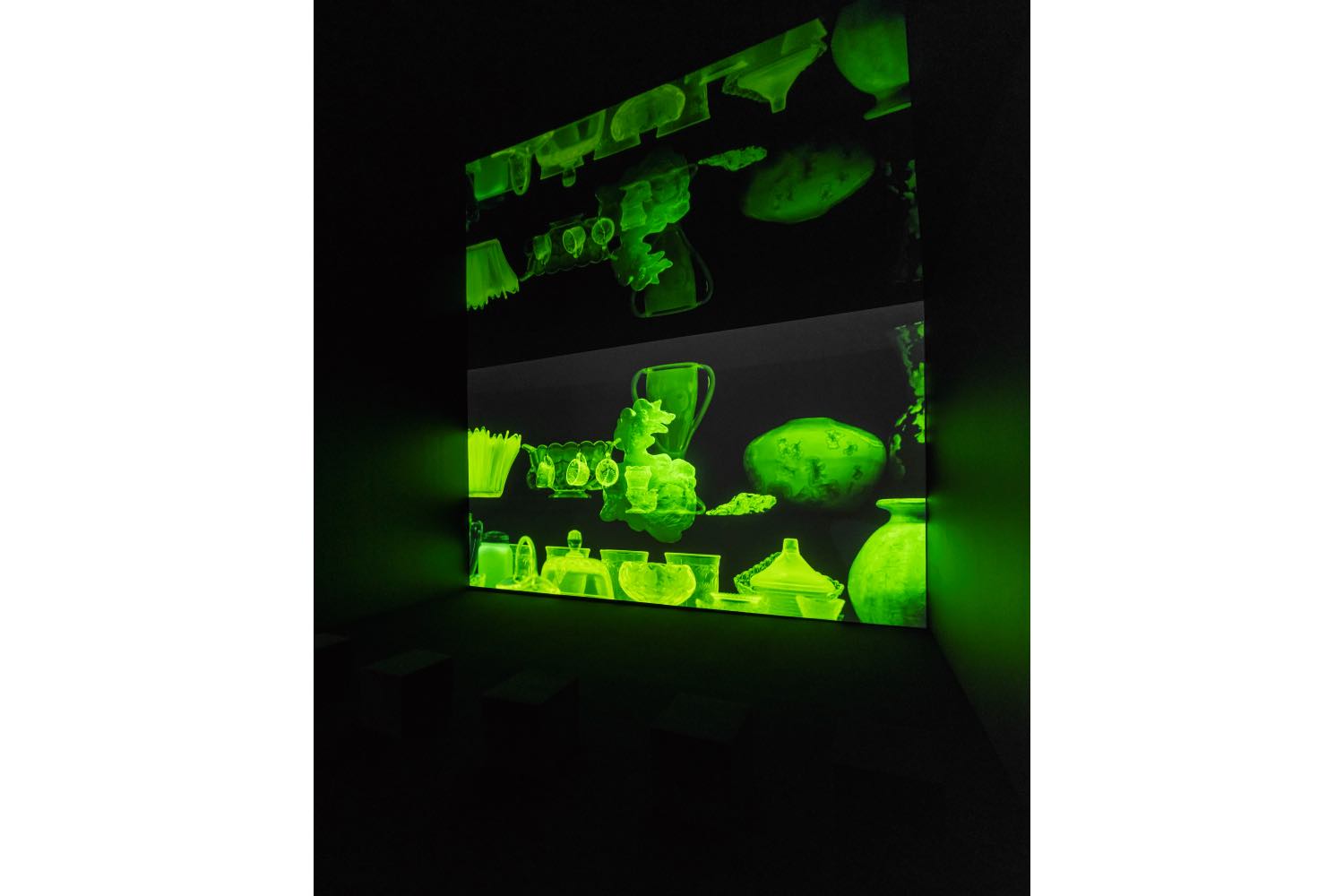 The struggle over labor — who owns it and who gets to represent it — lends itself to cinematic narratives. Andro Eradze’s Flowering and Fading (2024) employs a slow-moving camera surveying a domestic space at night. Gravity ceases to function as a gust of wind (perhaps aftershocks from revolutionary storms that hijacked the angel of history’s motions?) marches in. Furniture levitates, as alive as the wilderness outside. Symbols of nature and culture similarly no longer oppose each other in Emilija Škarnulytė’s Burial (2022) and Zhou Tao’s The Axis of Big Data (2024). In the former, a meandering serpent—a symbol of enlightenment or degradation of innocence — on control pads in a disused nuclear station creates suspension, slithering under a trapped camera that jumps between simulations of half-decay and wide, distant views of extractive energy infrastructures yet never enters the inhabited world beyond uranium imaginaries. In the latter, unmotivated studies of a data center’s computational units are clinical and claustrophobic. Luckily, Zhou’s narrative expenditure concentrates on refreshing, serene documentations of nearby villagers farming and raising animals. Long before the data center’s arrival and its technological time, human time has shaped contested lands and will continue to do so; it is evident the artist knows well. Elsewhere, a rare moment of clarity is found in Karimah Ashadu’s Brown Goods (2020), which, with an anthropological brevity, exhibits how exchange between the metropole and the periphery is a multi-directional movement of divergent, sometimes conflicting, ends.