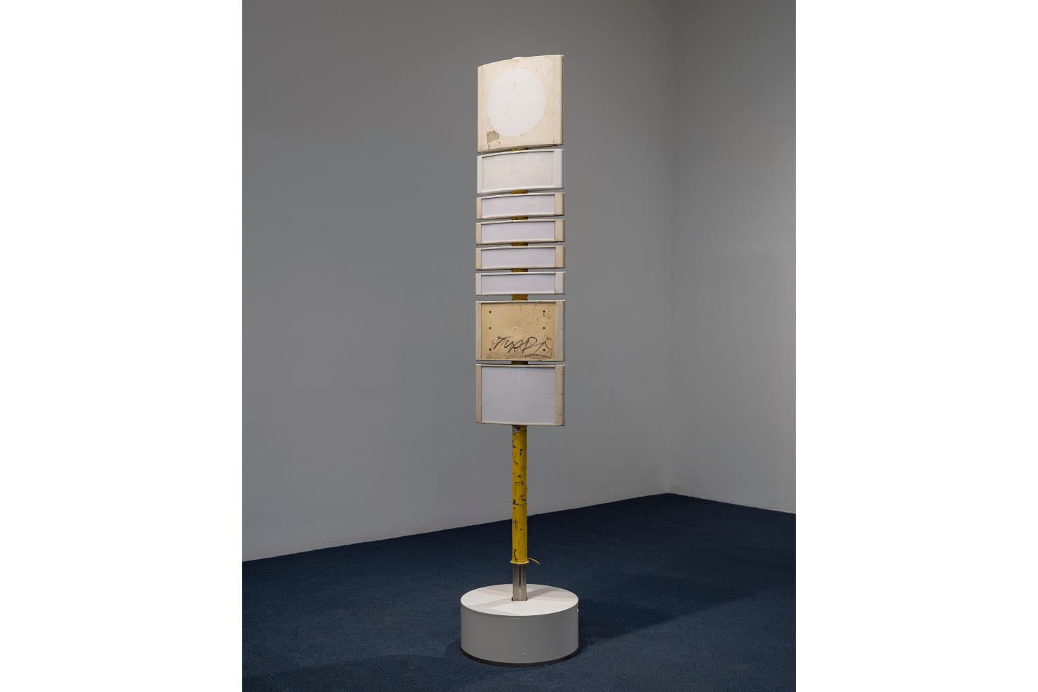 Phantoms — objects with only exchange value, haunted by lost use value, leaping into unrealized potentials and missed opportunities — form Tolia Astakhishvili’s immersive environment Wicked Plans (2025). Scattered architectural miniatures and models and exposed pipes and ducts suggest a construction site. Yet surrealist-influenced collages by Astakhishvili’s father and defaced pages from old magazines by the artist’s mother, sealed under plexiglass, unmistakably ground Wicked Plans in the dramatics of domesticity. Confusion between production and reproduction proliferates. On drywalls of various dimensions and scales layered upon each other irregularly, we see conspiratorial images of alternative lifestyles, family photos, snapshots of the artist’s social circle, drawings hinting at violent eroticism, documents sourced from unknown archives, confessional scribbles with no certain addressee acting out wish fulfillment, and residues of ghostly figures. All distinctions between historical disjuncture, linear time, séance, and exorcism are collapsed.