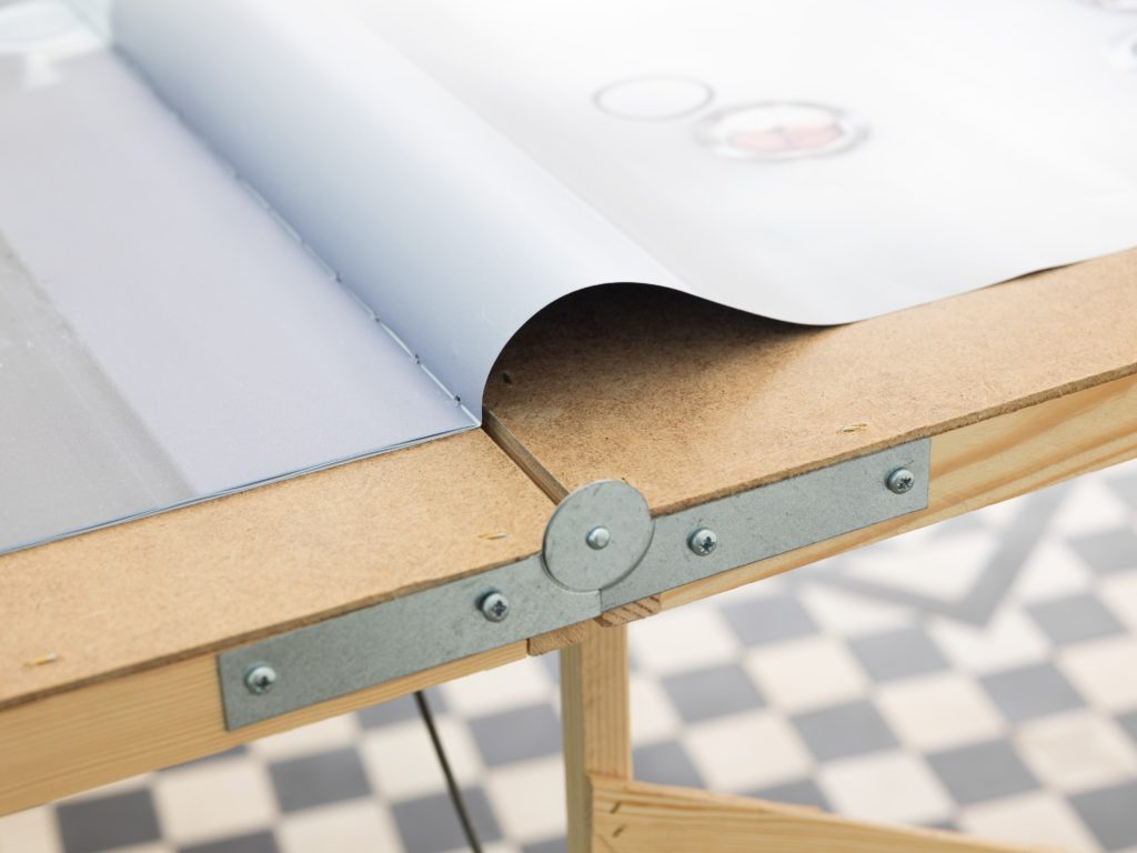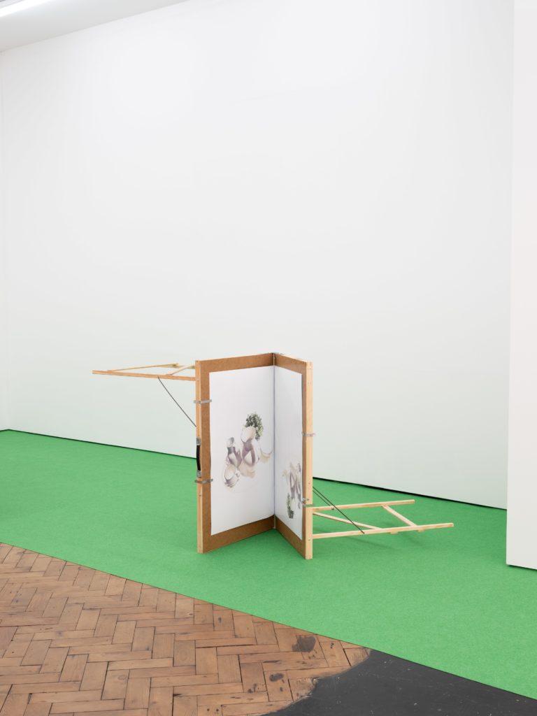 MacKillop’s affective installations are as much about excess as they are the absence that results from excess, over and over and over. In this way, the structure of her exhibitions offers a kind of poetic minimalism and bleak, stuttering modularity, like the dregs of furniture left at a closed-down IKEA — the subject of Ikea Tottenham (2023), one of her many artist books, which she also considers exhibitions or sculptures as in her 2024 show, “Expanded Pamphlets” at Roland Ross, Margate. As she re-installs iterations of related series for each show, the promise of clarity or comic relief produces its own structural fatigue, equal parts comfort and depletion as they hover at the threshold of not mattering or appearing not to matter. For instance, the signature display carpet, which first appeared in the exhibition at Roland Ross, arose as a “temporary solution” of cheap pragmatism to hide the noise of the gallery’s beautifully aged, checkered floor. In a related, seemingly practical gesture for her exhibition “Meanwhile…” (2025) at Final Hot Desert’s apartment venue in London, the artist choreographed upright rolls of wrapping paper to block the viewer from entering the domestic rooms upstairs — a useless barrier the artist compares to a decorative pinecone employed to stop people from sitting on a fancy chair.