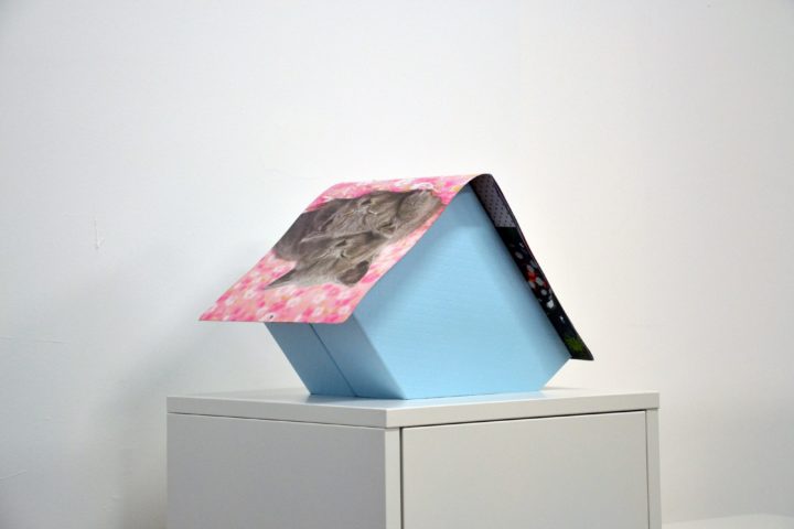 While her hard-edge forms allude to modernism’s imperative of “universal” design, the scale of her critique softens in the minutiae of consumer culture and home office decor. It seems appropriate that her sculptures often take the form of Container Store architecture in a series of maquettes for little modernist dwellings titled (as with most of her works) after exactly what they are. The “Calendar Houses” (2021–ongoing) series is constructed from empty archive boxes pushed together in perfect symmetry. These objects covertly rebrand the pressure of perfection under roofs made of wall calendars decorated with stock images of innocent sleeping kittens or a galloping horse in a sunny field. Plastic and cardboard surfaces of faux marble and handsomely color-blocked browns and yellows recall the Pantone Color of the Year now applied to big-box merchandise, holding the ersatz memory of design so quickly out of date.