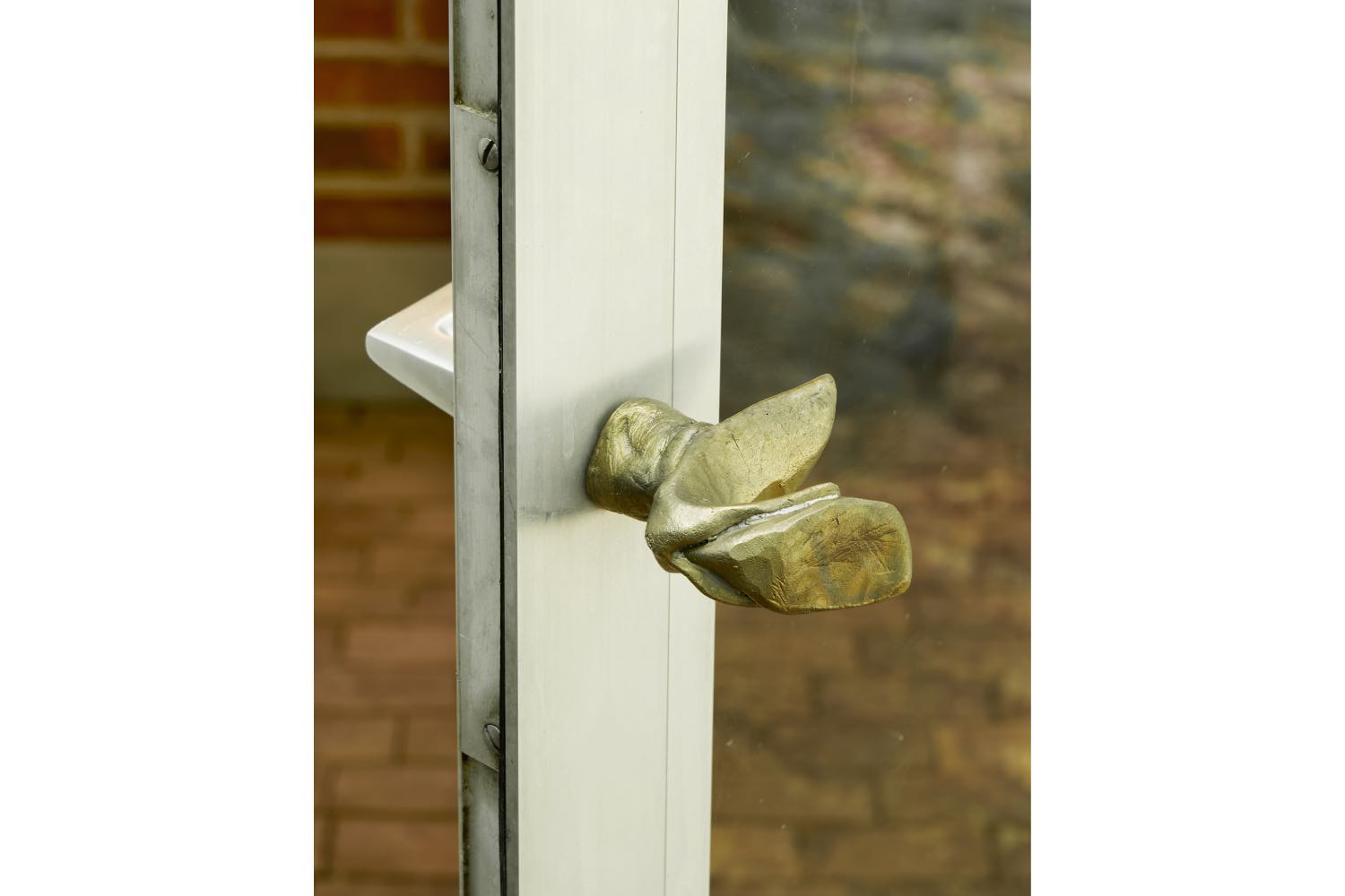 AF: “A Sock in the Eye” was part two in a series about the impact made by Danish legislation for architectural conservation. The upside of that was the “Man In House” show. It dealt with Copenhagen’s Danner House, a refuge for women who suffer from domestic violence, which was saved by the Danish women’s movement, who occupied it and had it protected. That show was a timeline, and group material-esque, that followed the house’s crazy history, but also was about the invisibility of domestic violence and the many internal issues and generational conflicts within the women’s movement, and also the maybe even more difficult question of what makes violent relations desirable. In this show, this was beautifully showcased in Nancy Lupo’s work Escape Handle 3 (2023), a bronze door handle molded as a cast of the space of a hand being held, which serves as the door handle of the studio. A show like that can be dangerous, and it relies on the work being able to fulfill its part in the narrative of the show while still maintaining its own internal agendas. Difficult, but when it works, it is amazing. Because there’s something at stake in how the works are shown and experienced.