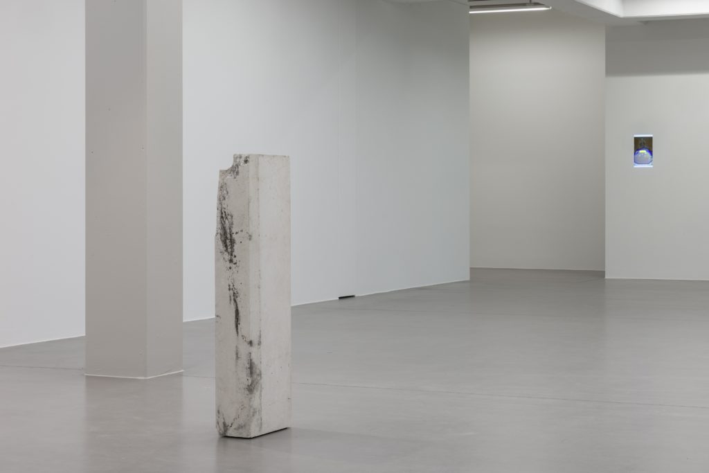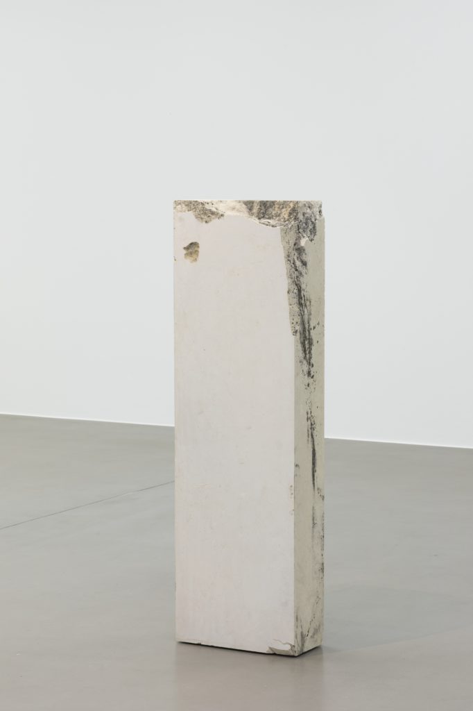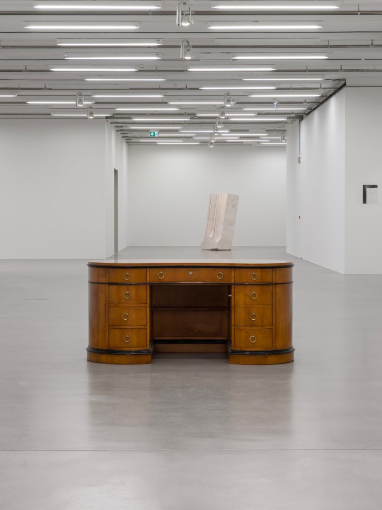 The predictably untitled exhibition comprises a series of marble pieces from past years, orchestrated across the two-thousand-square-meter space. The sculptures are punctuated by a smaller number of wall works: a silkscreen, a C-print, an embroidery, a still projection, a tiny video. Were it not for these interventions, which unequivocally locate the works within a contemporary era, the show might feel like the remnants of an unknown civilization. The colors and veining of the stones reveal processes sedimented across deep time. The shapes of the artifacts bear witness to human intervention, yet no information remains as to how they were made or what function they might serve. Unlike archaeological ruins, the works are organized throughout the space with methodical meticulousness, triggering the eerie sensation that everything must be exactly where it is for a reason. At the ideal center of the exhibition stands The Secretary (2008), a 1950s wooden desk that serves as an oddly mundane, gravitational hub in a galaxy of timeless- looking objects.
