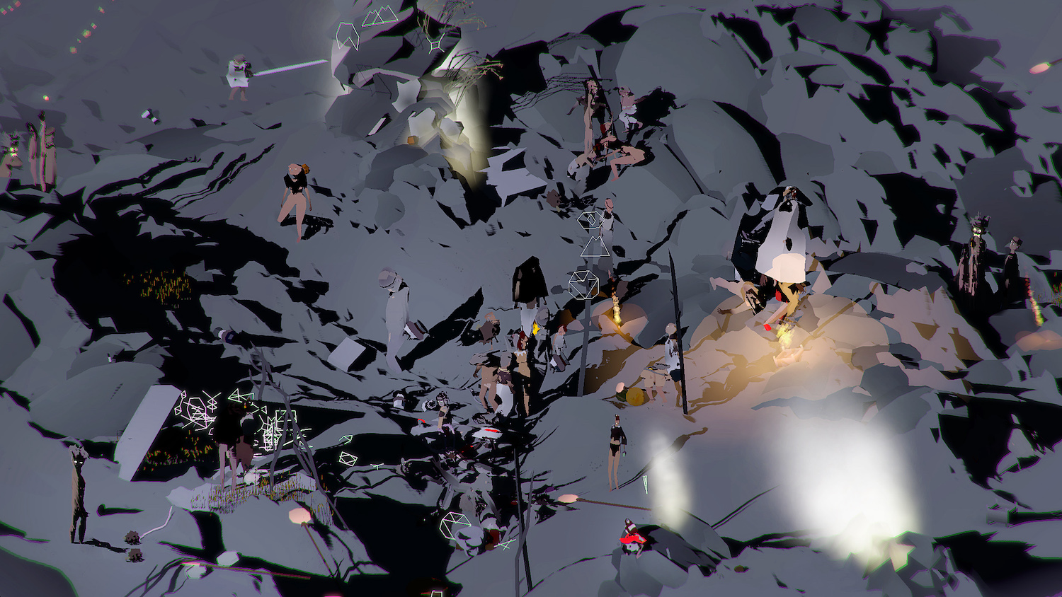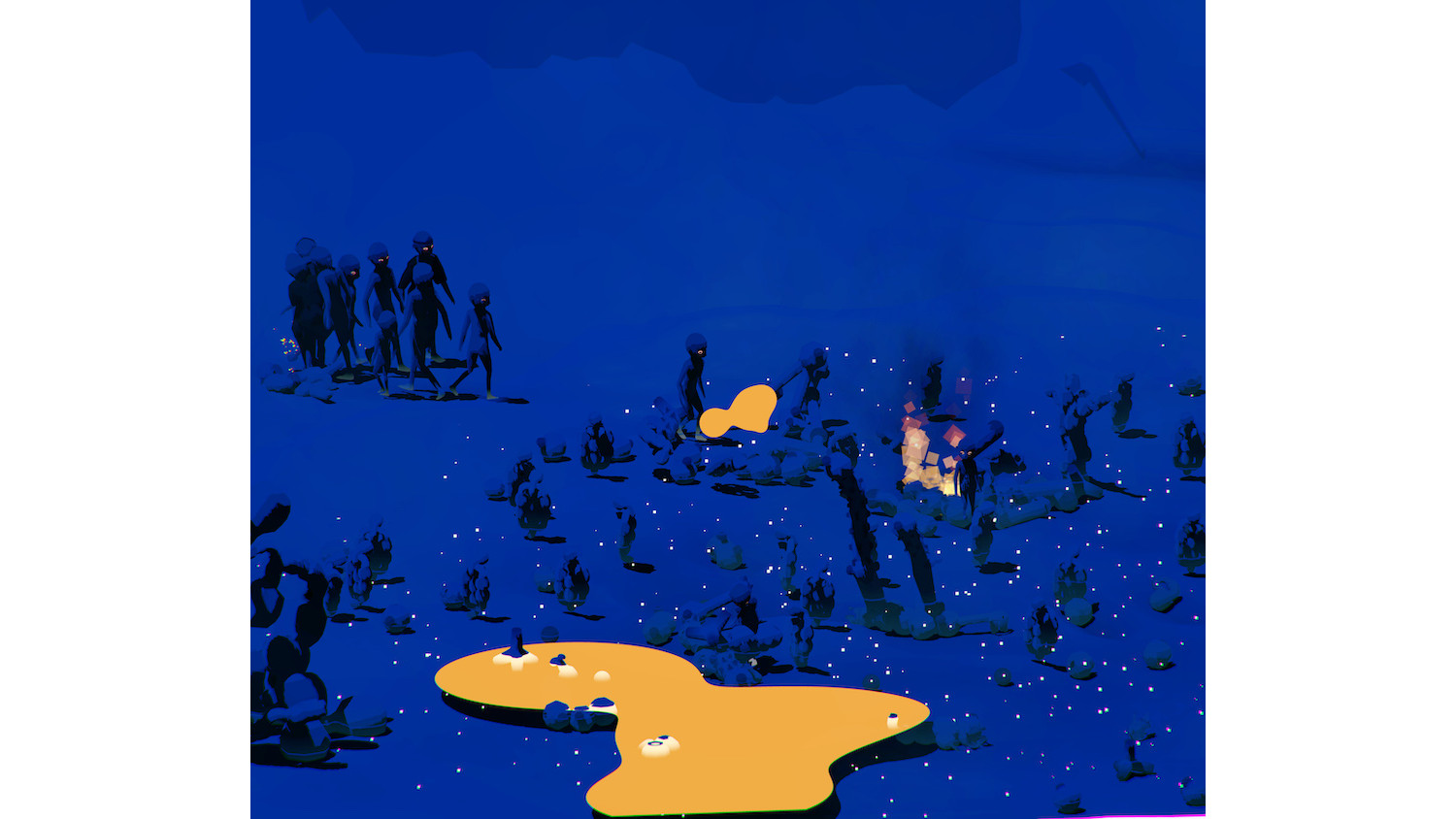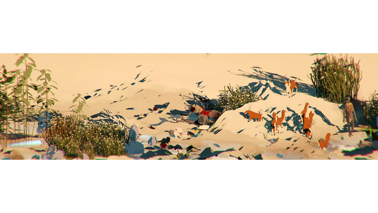 While busying herself with the gameplay loop envisioned by the developers, the player of an AI-generated world may observe such patterns as a recurring cluster of rocks or the newly spawned environment of the next level up. Only when a player becomes aware of the strictures of a rule-bound structure does she begin to see beyond the façade of the digital Potemkin village and to appreciate the virtual environment as the product of human creativity by virtue of its difference from the real world. In his “Emissaries” trilogy (2015–17), Ian Cheng investigated the potential of ceding authorial control through live, autonomous, and self-sustaining ecosystems created using a game engine. In these environments, characters and wildlife interact independently of one other, guided by the disguised direction of their maker. What makes Cheng’s work invariably so compelling is not the limited series of actions and combinations that each element is trained to perform, but rather the active cultivation of a newly entropic nature. Cheng’s virtual worlds highlight simultaneously the grandeur of their design as well as the ultimate futility of imposing artificial boundaries.