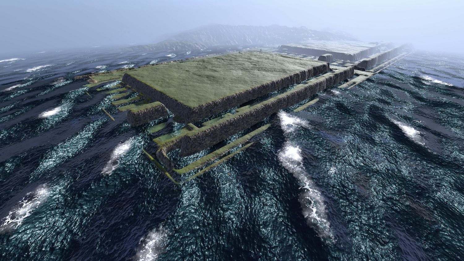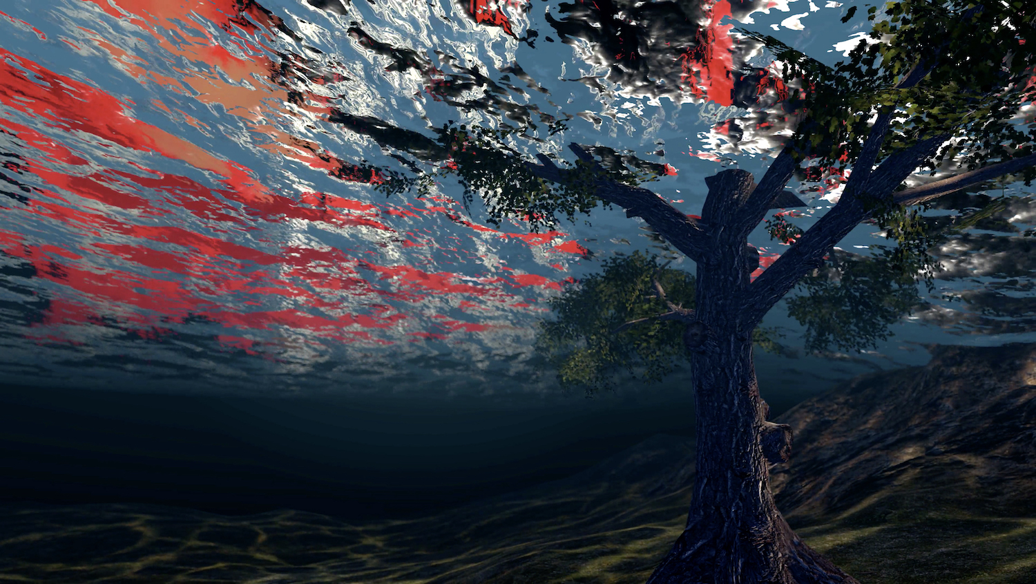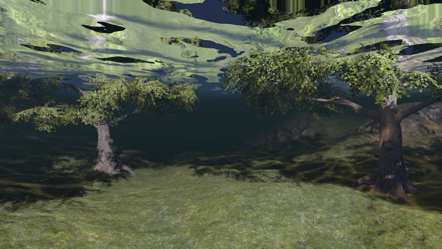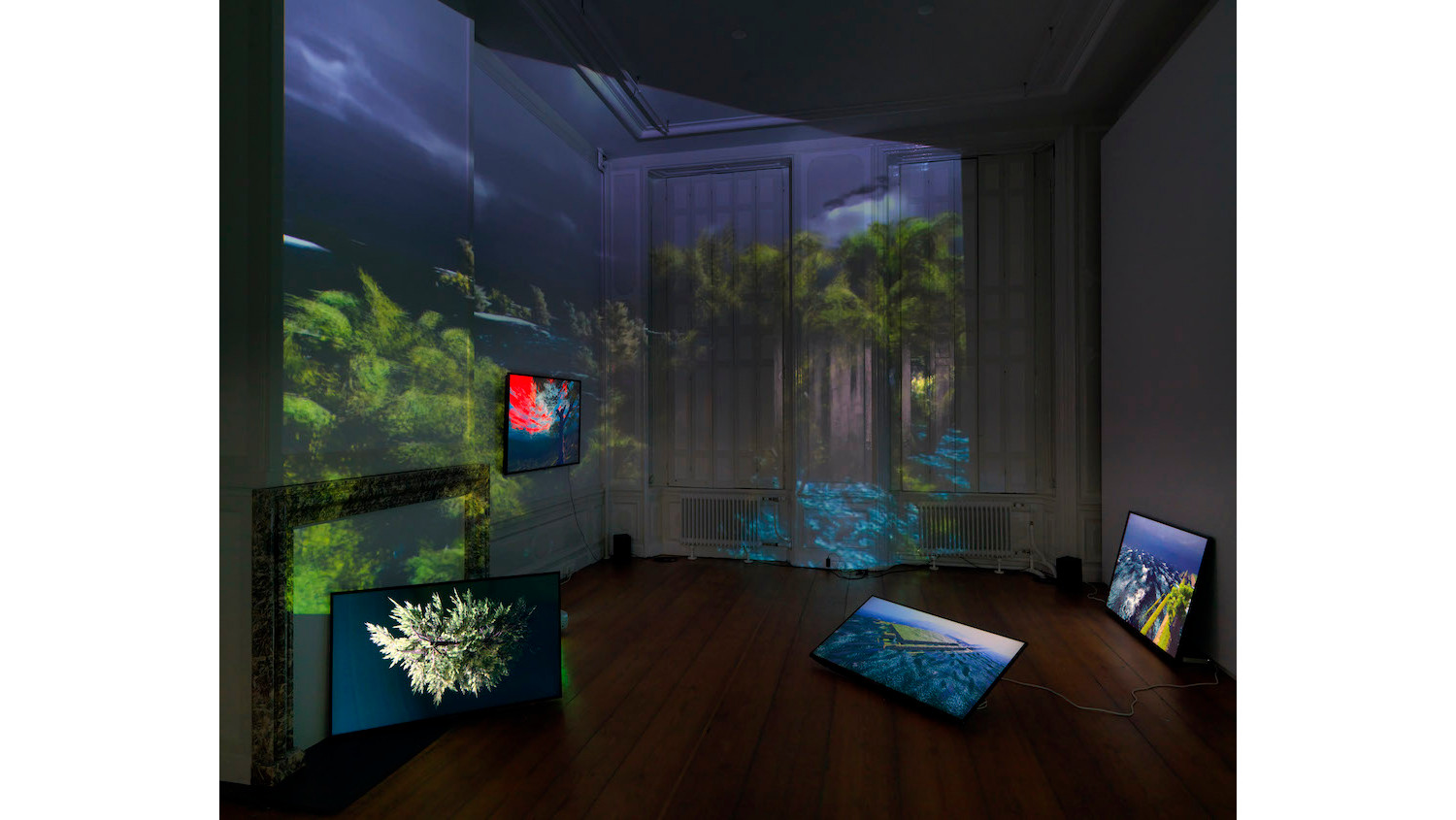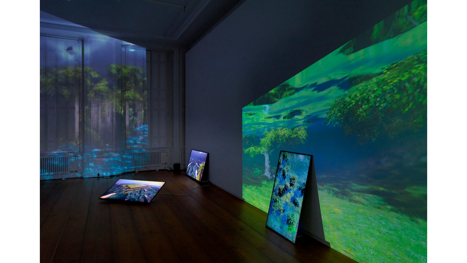 Artist Jan Robert Leegte (b. 1973) has recently explored the overwhelming nature of AI-generated worlds with Performing a Landscape (2020), a live installation comprising a storm-soaked landscape generated in front of the eyes of the public. Screens and projections offer a fragmented experience of the virtual landscape, leaving the viewer terrorized and disorientated by apparently preternatural forces. The spectator’s perspective is that of one submerged underwater, “safe” from the ensuing cataclysm overhead.